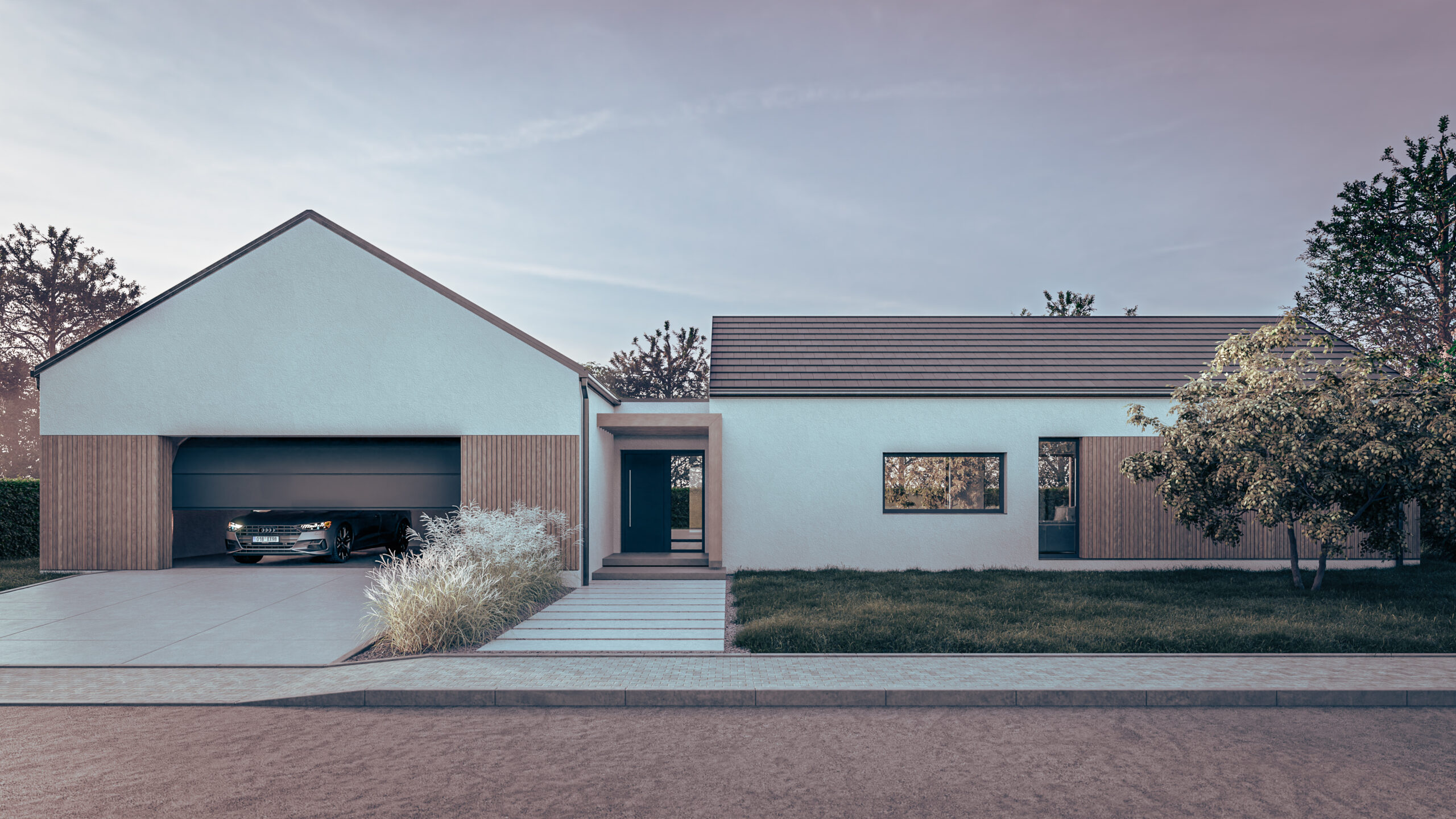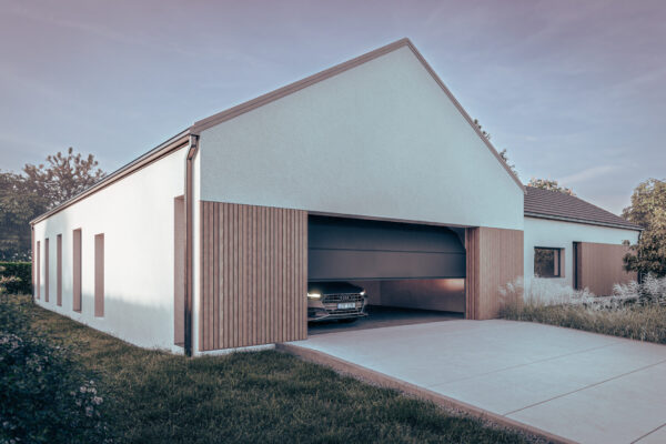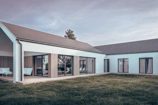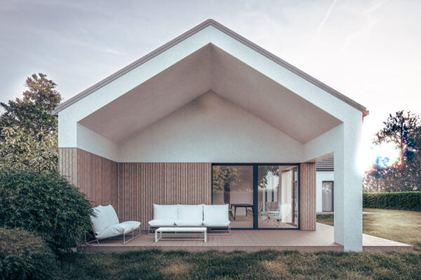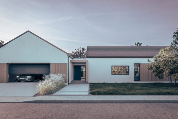 Cechą charakterystyczną budynku jest kompozycja dwóch brył założona na rzucie prostokąta, krytych dachem dwuspadowym, stanowiąca odniesienie do zawsze aktualnej tradycyjnej formy we współczesnym wydaniu podkreśloną materiałami wykończeniowymi elewacji, dużymi szkleniami części dziennej oraz niebanalną formą zadaszenia tarasu powstałą z przedłużenia dachu.