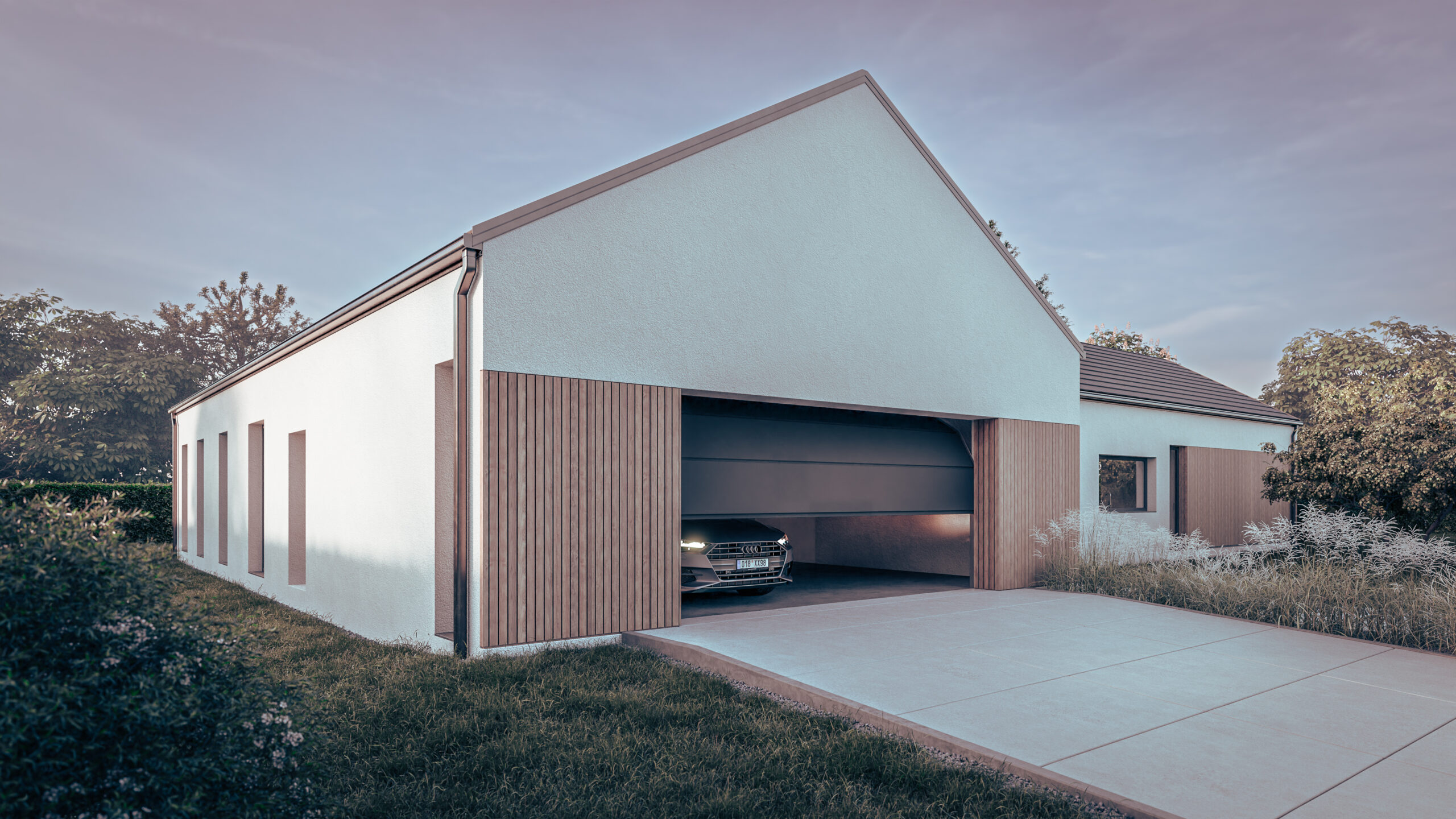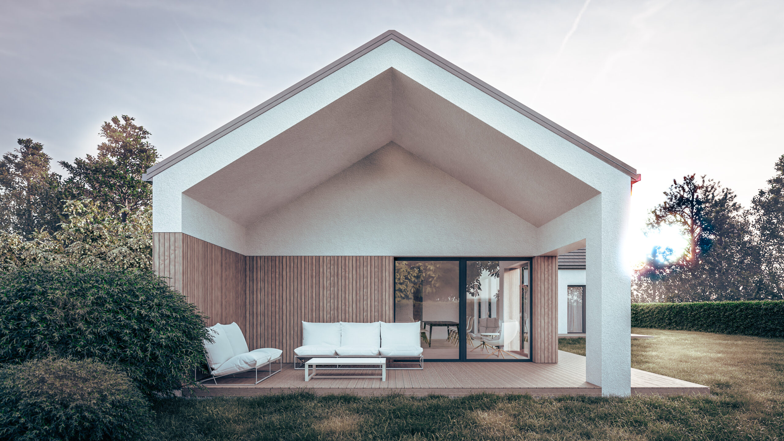 układ brył założony na literze L tworzy naturalny wewnętrzny ogród uzupełniający funkcję mieszkalną i rekreacyjną domu.